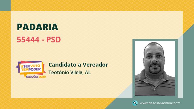Candidato do PSD para Vereador, Padaria obteve 202 votos e está como Suplente Vereador em Teotônio Vilela nas Eleições 2020.