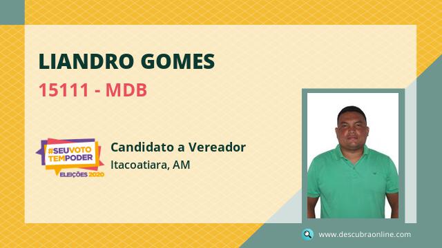 Candidato do MDB para Vereador, Liandro Gomes obteve 86 votos e está como Suplente Vereador em Itacoatiara nas Eleições 2020.