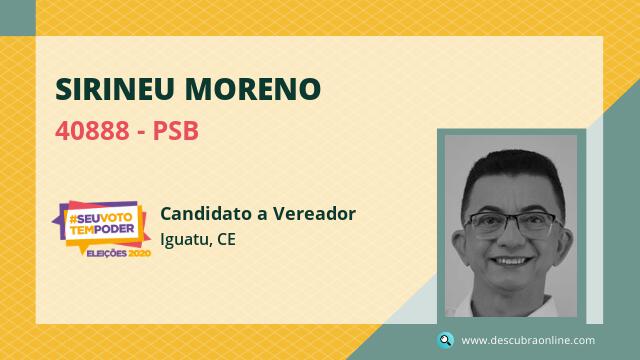 Candidato do PSB para Vereador, Sirineu Moreno obteve 193 votos e está como Suplente Vereador em Iguatu nas Eleições 2020.