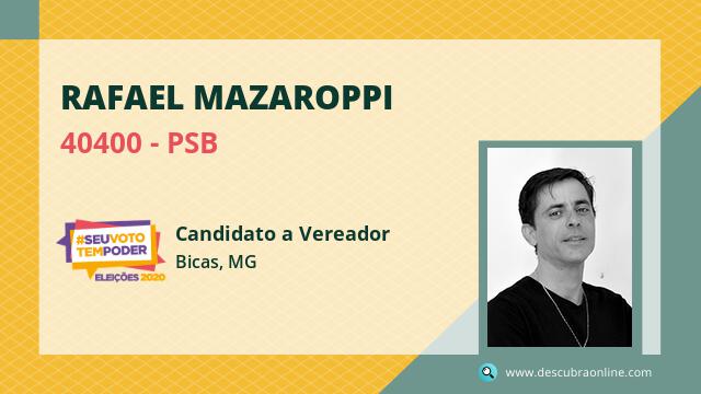 Candidato do PSB para Vereador, Rafael Mazaroppi obteve 40 votos e está como Suplente Vereador em Bicas nas Eleições 2020.