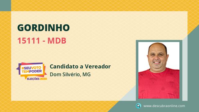 Candidato do MDB para Vereador, Gordinho obteve 50 votos e está como Suplente Vereador em Dom Silvério nas Eleições 2020.