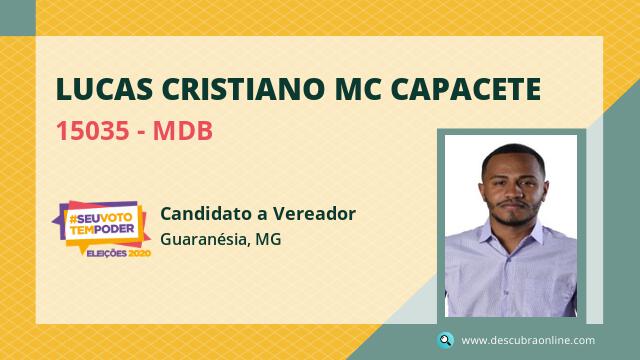 Candidato do MDB para Vereador, Lucas Cristiano Mc Capacete obteve 313 votos e foi eleito Vereador em Guaranésia nas Eleições 2020.