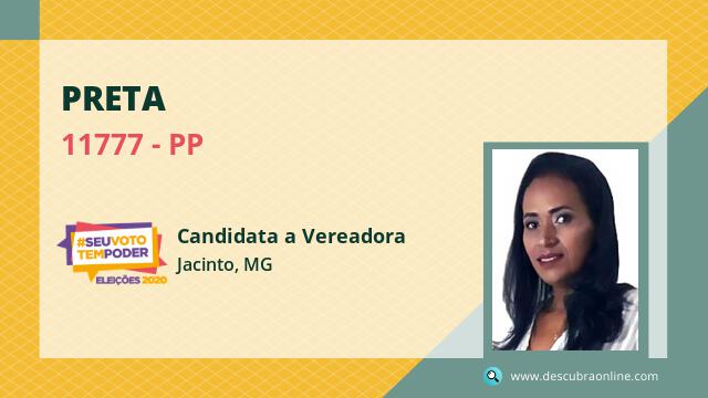 Candidata do PP para Vereador, Preta obteve 5 votos e está como Suplente Vereador em Jacinto nas Eleições 2020.