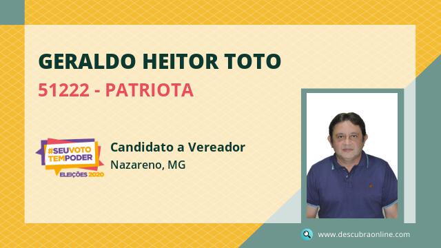 Candidato do PATRIOTA para Vereador, Geraldo Heitor Toto obteve 82 votos e está como Suplente Vereador em Nazareno nas Eleições 2020.