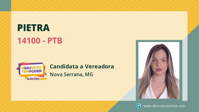 Candidata do PTB para Vereador, Pietra obteve 253 votos e está como Suplente Vereador em Nova Serrana nas Eleições 2020.