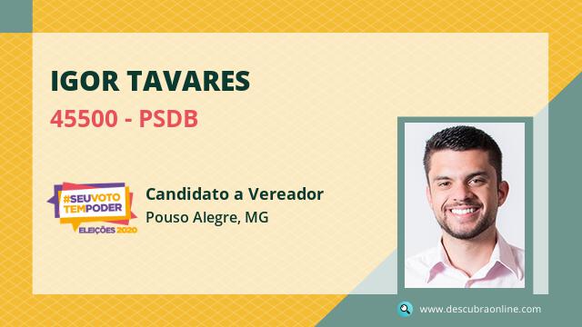 Candidato do PSDB para Vereador, Igor Tavares obteve 1273 votos e foi eleito Vereador em Pouso Alegre nas Eleições 2020.
