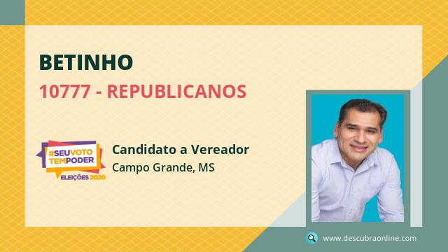Candidato do REPUBLICANOS para Vereador, Betinho obteve 3498 votos e foi eleito Vereador em Campo Grande nas Eleições 2020.