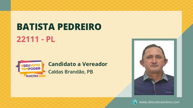 Candidato do PL para Vereador, Batista Pedreiro obteve 19 votos e está como Vereador em Caldas Brandão nas Eleições 2020.