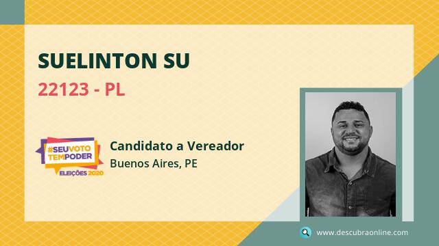 Candidato do PL para Vereador, Suelinton Su obteve 6 votos e está como Suplente Vereador em Buenos Aires nas Eleições 2020.