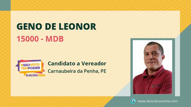 Candidato do MDB para Vereador, Geno de Leonor obteve 104 votos e está como Suplente Vereador em Carnaubeira da Penha nas Eleições 2020.