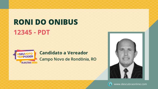 Candidato do PDT para Vereador, Roni do Onibus obteve 157 votos e está como Suplente Vereador em Campo Novo de Rondônia nas Eleições 2020.