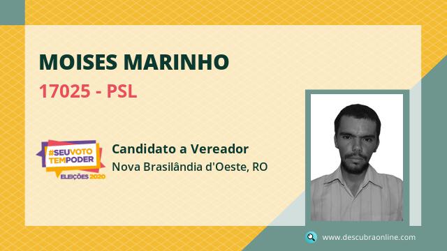 Candidato do PSL para Vereador, Moises Marinho obteve 19 votos e está como Suplente Vereador em Nova Brasilândia d'Oeste nas Eleições 2020.