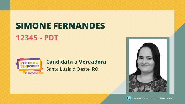 Candidata do PDT para Vereador, Simone Fernandes obteve 17 votos e está como Suplente Vereador em Santa Luzia d'Oeste nas Eleições 2020.