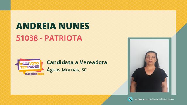 Candidata do PATRIOTA para Vereador, Andreia Nunes obteve 6 votos mas não foi eleito Vereador em Águas Mornas nas Eleições 2020.