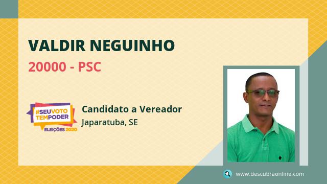 Candidato do PSC para Vereador, Valdir Neguinho obteve 831 votos e foi eleito Vereador em Japaratuba nas Eleições 2020.