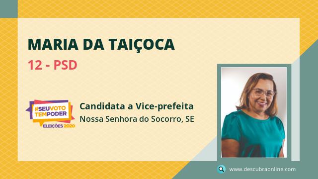 Nascida em 08/12/1956, Maria da Taiçoca tem 63 anos, natural de Nossa Senhora do Socorro - SE, Solteiro(a), Vereador.