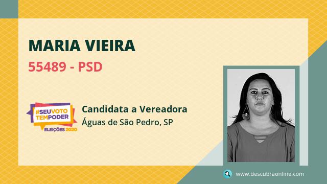 Candidata do PSD para Vereador, Maria Vieira obteve 2 votos mas não foi eleito Vereador em Águas de São Pedro nas Eleições 2020.