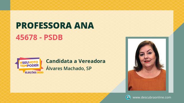 Candidata do PSDB para Vereador, Professora Ana obteve 229 votos e está como Suplente Vereador em Álvares Machado nas Eleições 2020.