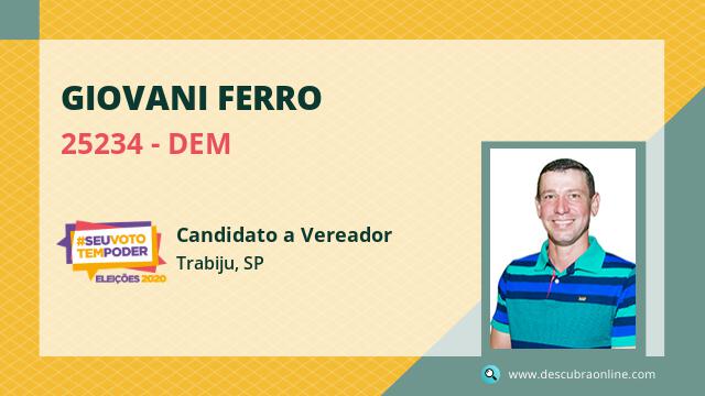 Candidato do DEM para Vereador, Giovani Ferro obteve 109 votos e foi eleito Vereador em Trabiju nas Eleições 2020.